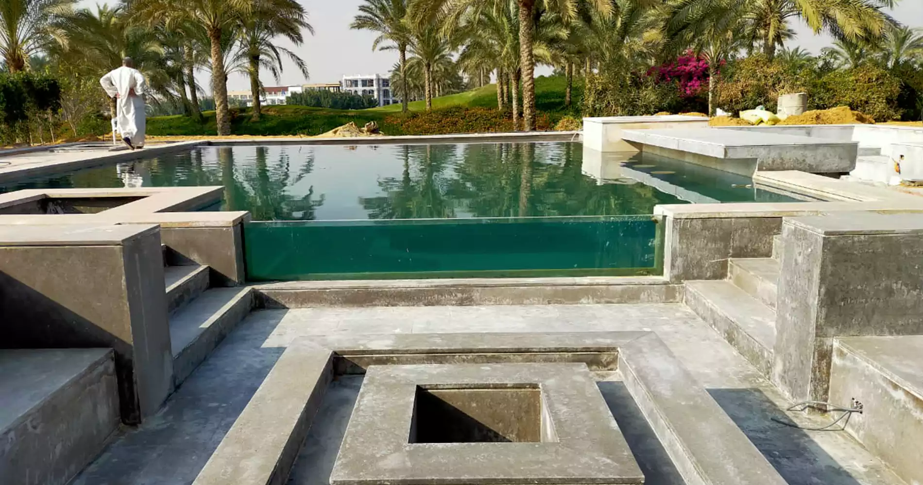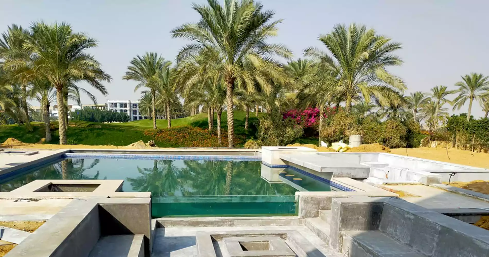 Finishing of the Horizon swimming pool with a glass sector on one side, for residential villa No. (174) Katameya Dunes - Fifth Settlement.
